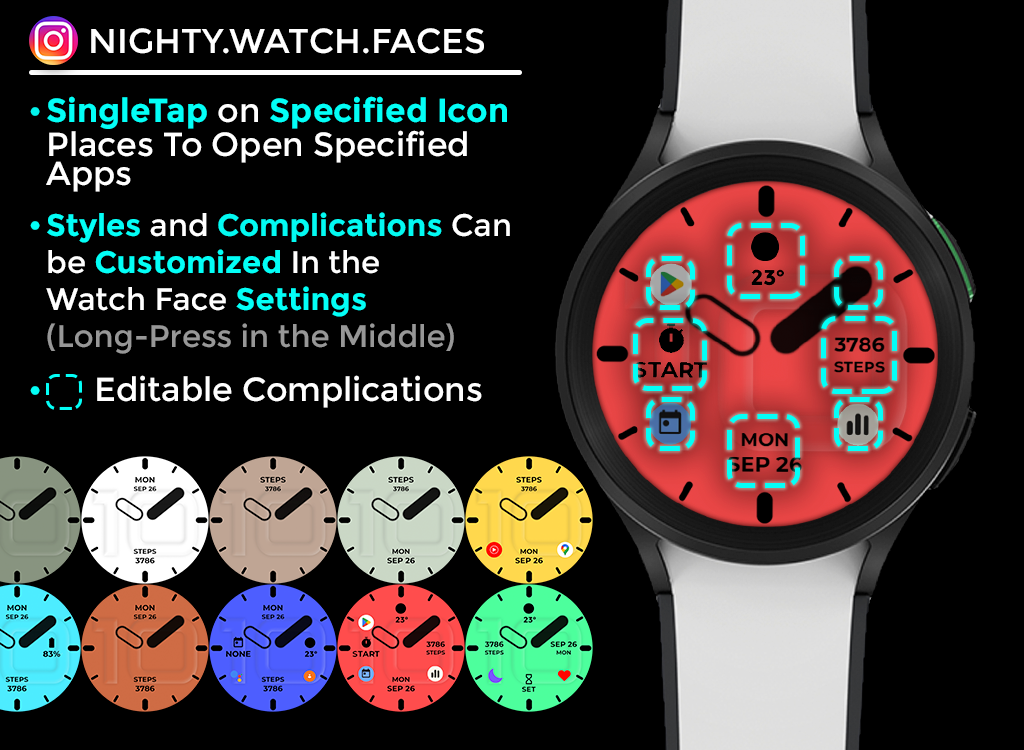 • Stile und Komplikationen können in den Ziffernblatteinstellungen angepasst werden (langes Drücken in der Mitte)