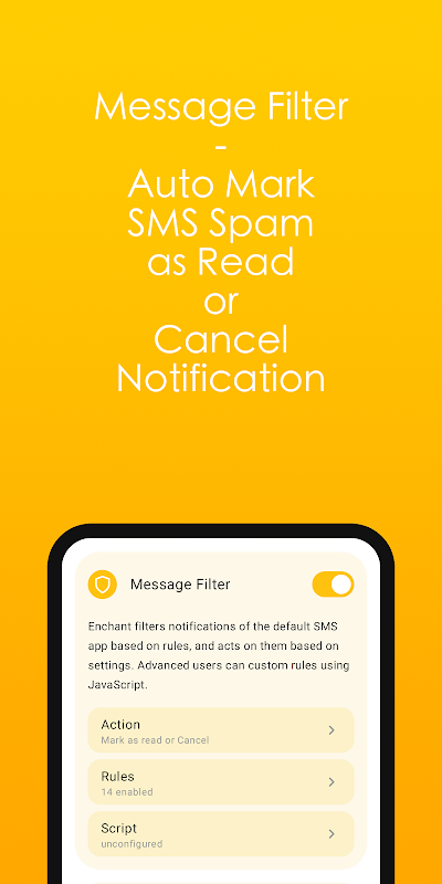 Enchant filtert Benachrichtigungen der Standard-SMS-App basierend auf Regeln und reagiert basierend auf den Einstellungen darauf. Fortgeschrittene Benutzer können Regeln mithilfe von JavaScript anpassen.