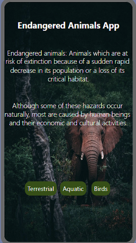 Diese App zeigt die verschiedenen Arten gefährdeter Tiere, ihre Namen, Populationen und ihre Beschreibungen.