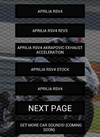 App every bike enthusiast needs - enjoy the epic engine exhaust sounds of RSV4. Brutally loud and epic accelerations, revs and fly by's! Fix your daily bike craving with this amazing app!