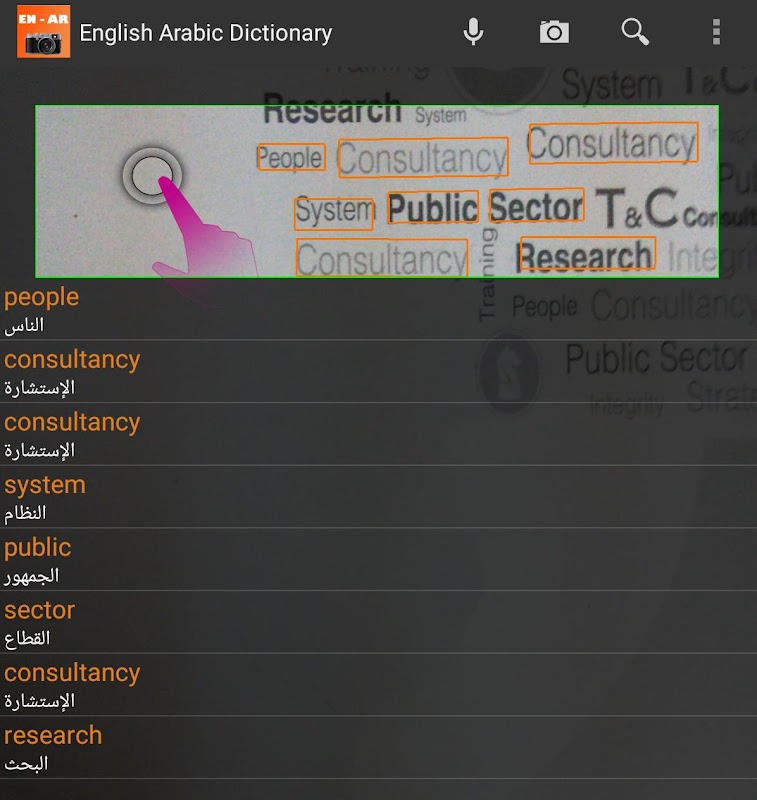 + Keine Notwendigkeit zur Eingabe von Text oder Texterfassung. Es wird Text und pharse automatisch erkennen und übersetzen Englisch auf Arabisch.