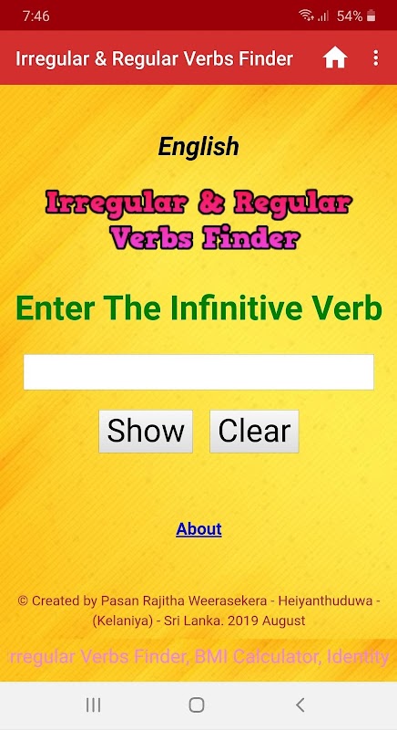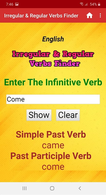 The most of the Verbs in English Language are mostly added ‘ed’ at the end, when they are converted into Past Tense and Past Participle. But there are some verbs, which are not added ‘ed’ at the end also. For an example the Irregular verbs like Go, Went, Gone can be forgotten and unknown. So there is an easy way to get all the Past Tenses and Past Participles of such Irregular & Regular Verbs from this App…