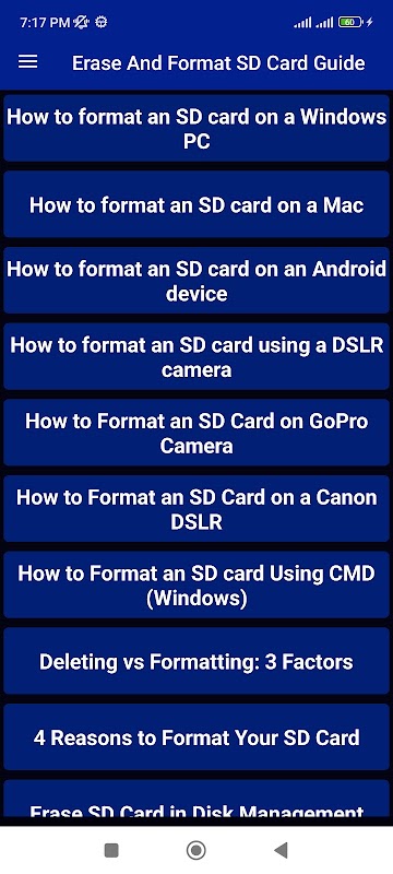 Diese Anwendung ist eine benutzerfreundliche Anleitung zum dauerhaften Löschen von Dateien und zum Freigeben von Speicherplatz auf einer SD-Karte. Durch das Formatieren einer SD-Karte werden alle darauf gespeicherten Fotos, Videos und Dateien entfernt. Es ist eine sehr nützliche Leitfaden-App mit einigen Tricks.