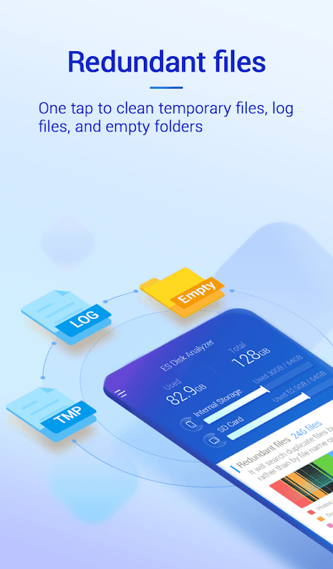One tap to free up disk space and clean file trash by finding out temporary files, log files, and empty folder