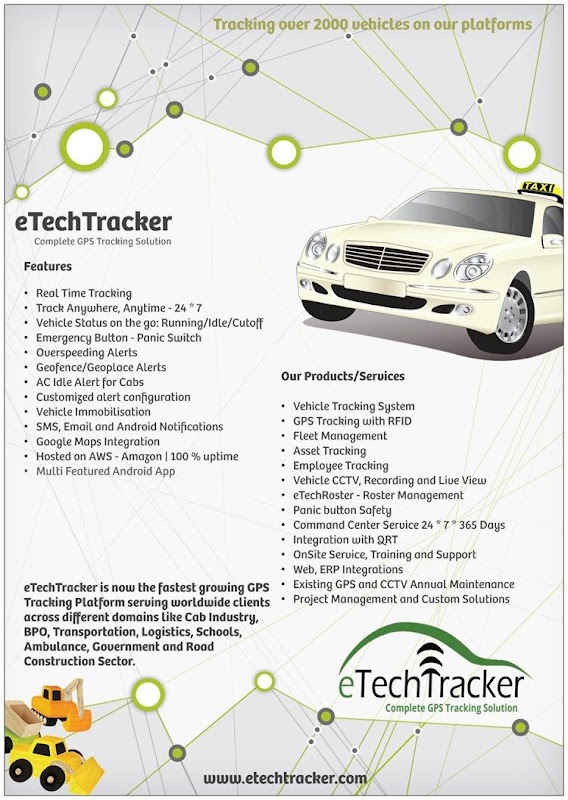 eTechTracker ist GPS-basierte Fahrzeugverfolgungssystem. Das Global Positioning System (GPS) ist ein space-based globales Navigationssatellitensystem, das bei jedem Wetter und zu jeder Zeit und an jedem Ort auf oder nahe der Erde zuverlässige Position und Zeitinformationen bietet es eine freie Sicht auf vier oder mehr GPS-Satelliten . eTechTracker bietet internetbasierten Zugriff auf Live-Fahrzeug-Tracking-und Asset-Management. Zu wissen, wo Ihre Fahrzeuge und Anlagen sind zu jeder Zeit gibt Ihnen die Macht, um Zeit und Geld sparende Entscheidungen mit einem schnellen Blick zu machen.