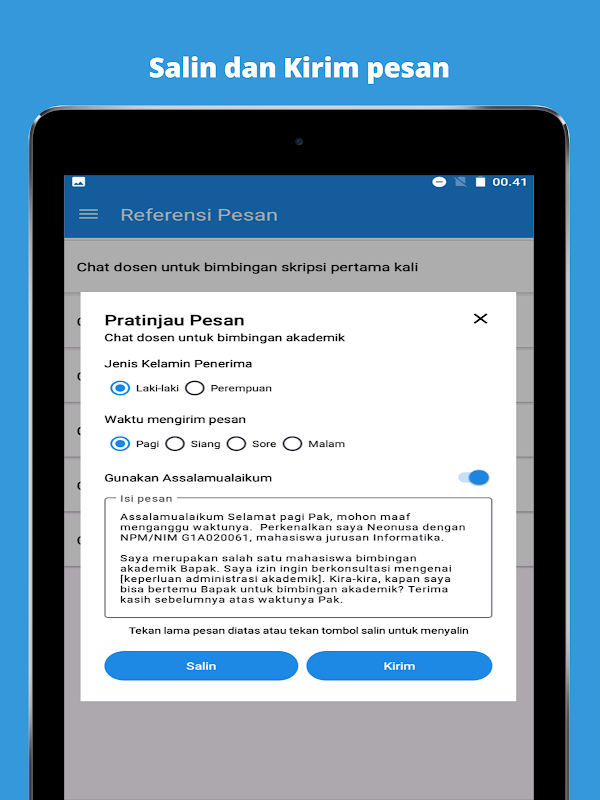 „Ethics in How to Chat with Lecturers“ ist eine Anwendung, die speziell entwickelt wurde, um Studenten dabei zu helfen, effektiv und höflich per Textnachricht mit Dozenten zu kommunizieren. Diese Anwendung stellt Leitfäden und verschiedene Referenzen bereit, die Studierenden dabei helfen können, geeignete, formelle und angemessene Sätze zu verfassen, wenn sie Dozenten zu verschiedenen Zwecken kontaktieren, z. B. um Rat zu bitten, sich nach Stundenplänen zu erkundigen oder Abschlussgespräche zu führen.