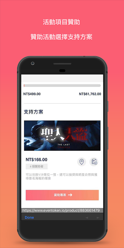 1. 活動主辦方可以在策劃階段就來平台發佈專案贊助計畫,藉此接受廣大群體的贊助支持,所有贊助內容都會產生一智能合約 (Smart Contract) 將權利、義務、各種特權兌換與獎勵回饋,都能透過智能合約來履約。