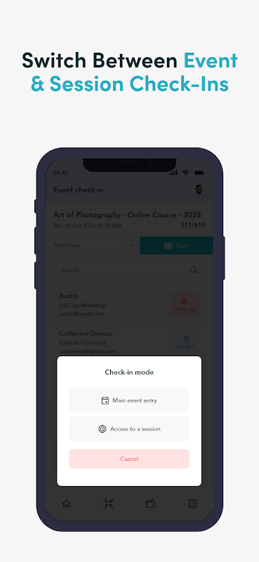 - Leicht in Teilnehmer überprüfen, indem Sie ihren Namen suchen oder gerade die Liste (Alternate zum Scannen des Ticket)