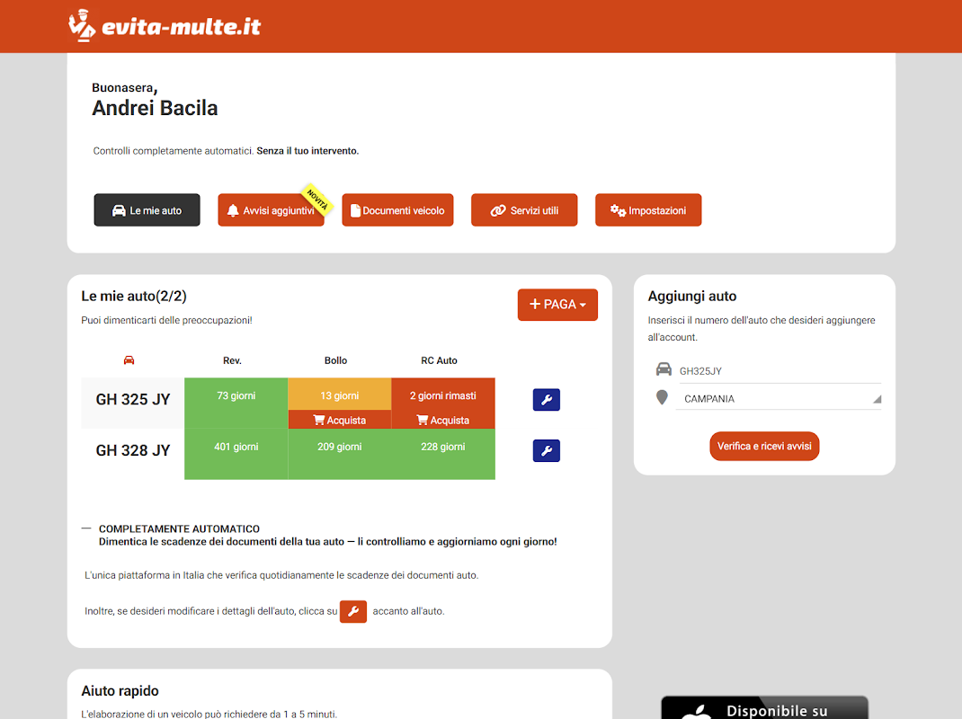Sobald Sie Ihre Fahrzeugdaten eingegeben haben, prüft evita-multe.it automatisch alle Ihre Fahrzeugdokumente und benachrichtigt Sie per SMS, wenn jedes Dokument abläuft.