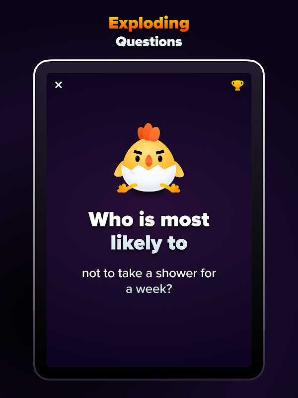Die Spielenden müssen schnell verschiedenste wortbasierte Herausforderungen lösen und das Handy weiterreichen, bevor das Huhn explodiert. Explodiert das Huhn in deinen Händen, verlierst du ein Leben! Ein einfaches, aber extrem lustiges Spiel für Gruppen!