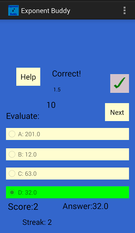 Exponent Buddy ist eine App soll Ihnen helfen, zu lösen und zu binden Exponenten die Fähigkeit zur Lösung von Exponenten.