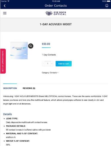 Schedule eye exams, purchase contacts, check out the latest in fashionable sun glasses... all on the Eye Docs Optical business application.