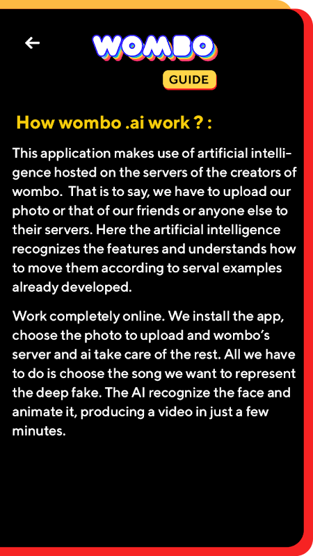 This is not the official application and also isn't sponsored by "Wombo" this is just a guide app that helps users to learn how to use the application properly.