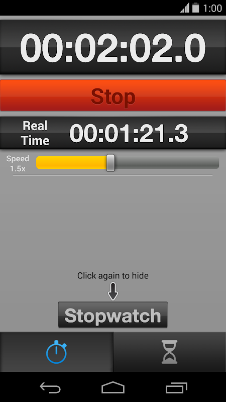 -To set up the stopwatch, click on the "stopwatch" button on the bottom on the screen to show the hidden controls and slide the bar to adjust how fast the fake stopwatch will run.