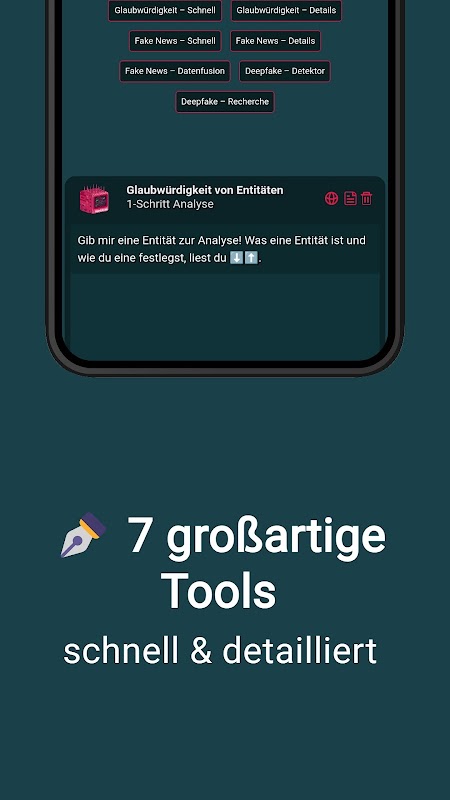 - Eingabeanalyse 📝: Überprüfe anhand von Texten, Artikeln, Weblinks und YouTube-Videos. Die App nutzt spezialisierte Algorithmen zur Analyse, um relevante Informationen herauszufiltern und die Inhalte gründlich zu bewerten.