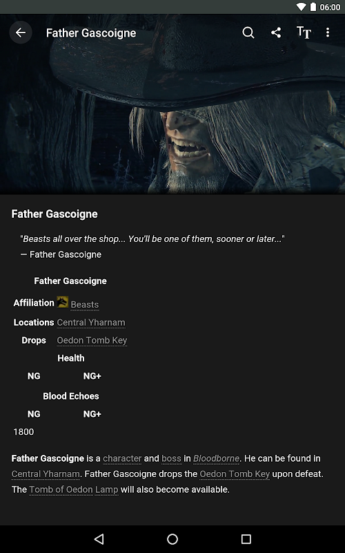 Der Superfan-Guide zu Bloodborne, von Fans für Fans erstellt. Wikia-Apps sind mit akkuraten Echtzeit-Informationen aus Wikias riesiger Fan-Gemeinde immer auf dem neuesten Stand. Die Bloodborne-App enthält hunderte von Seiten mit Inhalten, erstellt von Fans wie dir. Hier findest du ausführliche Artikel über Artikel, Charaktere, NPCs, Feinde, Bosse, Gameplay, Spielmechaniken, Währungen, Orte und vieles mehr. Keine andere App bietet diese Menge an präzisen Einblicken, Tipps und Informationen mit nützlichen Begleitfunktionen wie zum Beispiel: