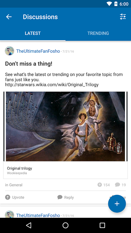 - Browsing: Schmökere in von der Star Wars-Community erstellten Kategorien und Artikeln, und sortiere sie nach aktuellen Trends