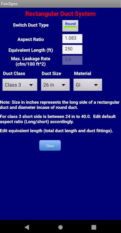 Benutzer können beliebige Kanalsystem wählen, basierend auf Querschnitt, Klasse, Größe und Material. Nach der Auswahl aktualisiert App AUTO Der Kanal Leckraten nach empfohlenen Standards. Die äquivalente Gesamtlänge Daten für die Auswertung von Luftkanalverluste, die Widerstand enthält aufgrund der unterschiedlichen Kanalformstücke und Klemmenkästen verwendet.