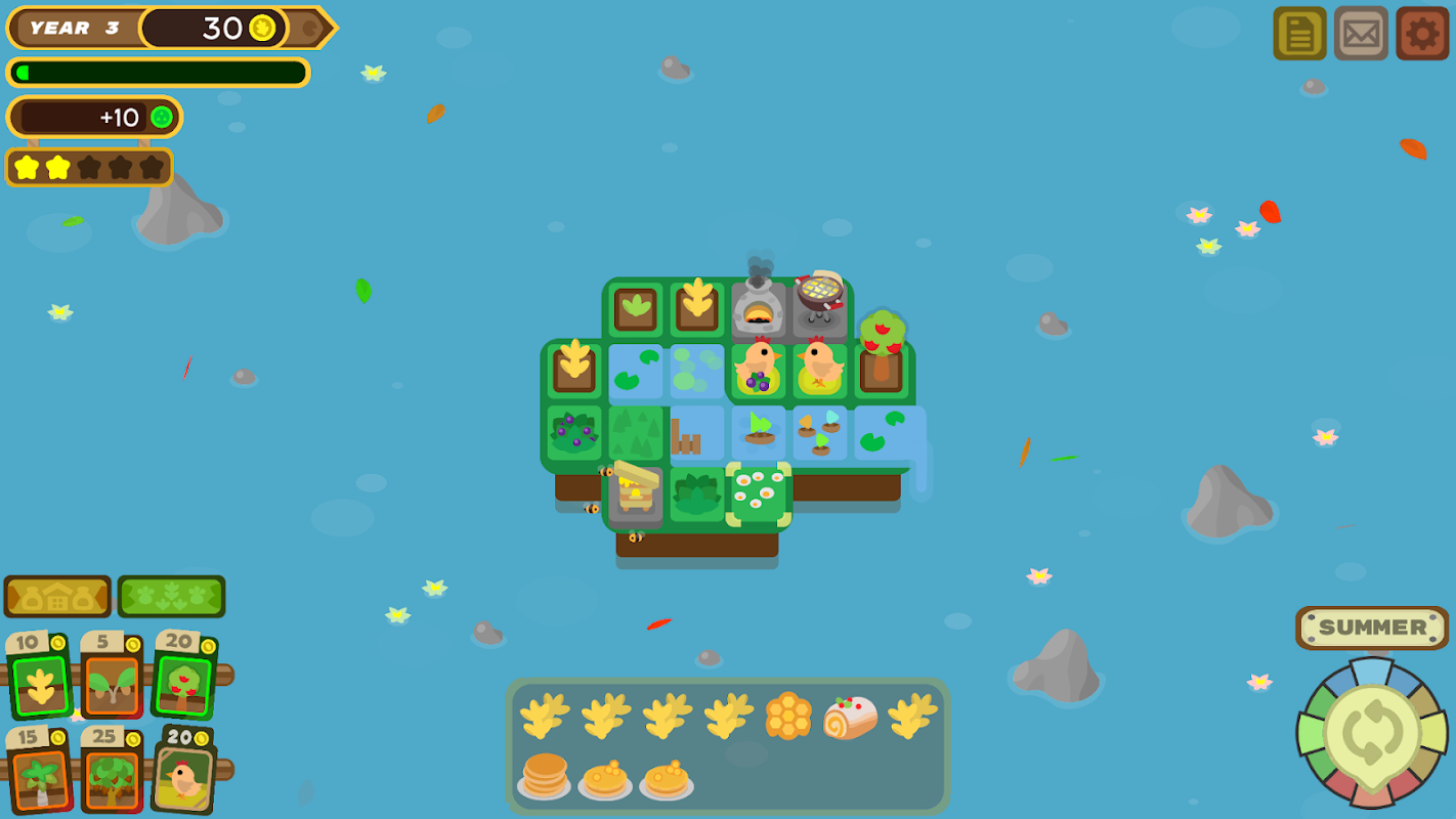 Jede Runde dauert einen Monat. Verschiedene Pflanzen sollten zur richtigen Jahreszeit gepflanzt werden, sonst wachsen sie nicht. Manche Gebäude benötigen außerdem eine bestimmte Jahreszeit oder besondere Bedingungen: Fische sollten im Sommer oder Herbst gefangen werden, Wasser in der Nähe ist wünschenswert. Bienen bringen jedoch nur im Sommer Honig, und je mehr Pflanzen es gibt, desto mehr Honig gibt es.