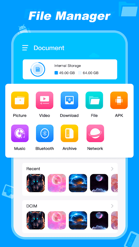Dateimanager und Dateibrowser ist eine leistungsstarke und benutzerfreundliche App, mit der Sie alle Dateien auf Ihrem Gerät anzeigen können, einschließlich Bilder, Videos, Downloaddateien, Dokumentdateien, APK-Dateien und Musikdateien. Dank der intuitiven Benutzeroberfläche können Sie ganz einfach durch Ihre Dateien und Ordner navigieren und schnell die benötigten Dateien finden.