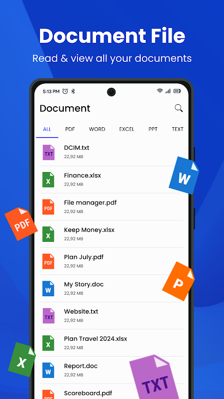 📂 Der Funktionsumfang des Dateiorganisators bringt die Dateiorganisation auf ein neues Niveau, um alle Inhalte an einem Ort anzuzeigen und zu überprüfen. Organisieren Sie Ihre Dateien ganz einfach in Ordnern, Unterordnern und Kategorien, um sie schnell zu finden. Alle Fotos, Videos, Audiodateien, Dokumentdateien, komprimierten Dateien, APKs und heruntergeladenen Dateien werden in einer Liste organisiert. Dieser konsolidierte Ansatz hilft Ihnen, verschiedene Dateiformate mühelos zu verwalten und zu organisieren.