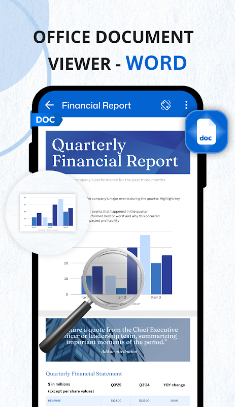 Suchen Sie nach einem Dokumentenleser, der alle Dokumente auf Ihrem Telefon öffnen kann? All Document Reader ist eine Komplettlösung, mit der Sie alle Arten von Dokumenten anzeigen können, einschließlich Word-, Excel-, PowerPoint-, PDF-, Text- und Komprimierungsdateien.