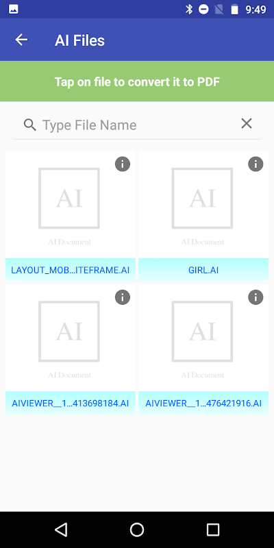 Wählen Sie die Dateierweiterung Wie in Adobe Illustrator (Ai) listet die Anwendung alle auf Ihrem Mobilgerät verfügbaren Dateien auf, die der vom Benutzer ausgewählten Erweiterung entsprechen. Der Benutzer kann auf die von der Anwendung aufgelisteten Dateien tippen, um sie in das PDF-Format (Portable Document Format) zu konvertieren.