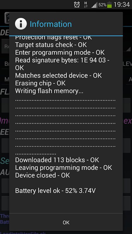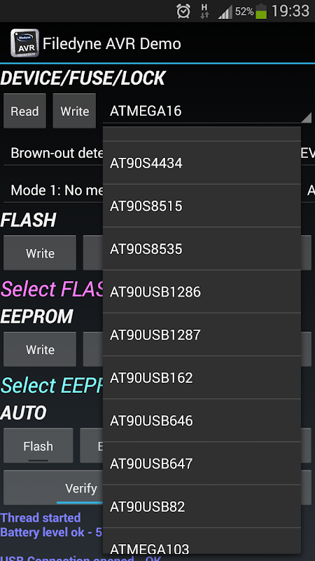 Filedyne AVR Demo is a tool for programming / upgrading AVR devices, using AVRISP mkII interface and USB OnTheGo(OTG) adapter.