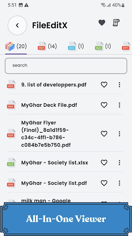 FileEditx ist Ihre Go-to-App zum Öffnen, Anzeigen und Bearbeiten aller Dateitypen an einem praktischen Ort. Sie müssen nicht mit mehreren Apps jonglieren – FileEditx kann alles verarbeiten, von PDFs, DOCs und Excel-Tabellen bis hin zu Bildern, PowerPoint-Präsentationen, ZIP-Dateien und mehr. Unsere App wurde entwickelt, um die Dateiverwaltung und -bearbeitung zu vereinfachen, unabhängig davon, ob Sie Student, Berufstätiger oder einfach jemand sind, der täglich mit einer Vielzahl von Dateien zu tun hat.