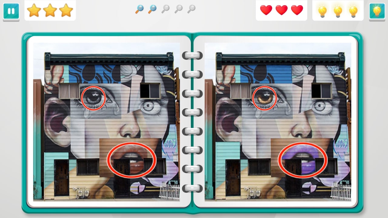 Achte auf alle Unterschiede in den Bildern, finde sie ohne Hinweise, um alle Sterne zu bekommen, entdecke alle Spielmodi und schalte alle Level frei.