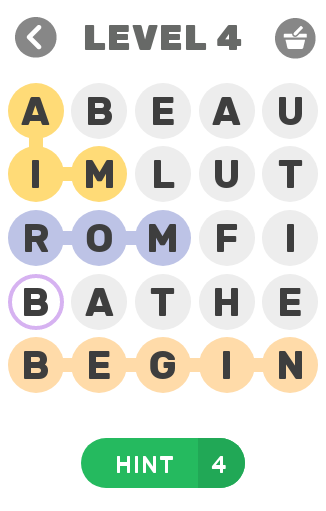 The goal of this word puzzle is using the given letters, combine them and make them into a word. Just the thought to slide your finger to connect the letters to combine a correct word! When hidden words found, you can use the clue to help finding other words and solve the word puzzle.