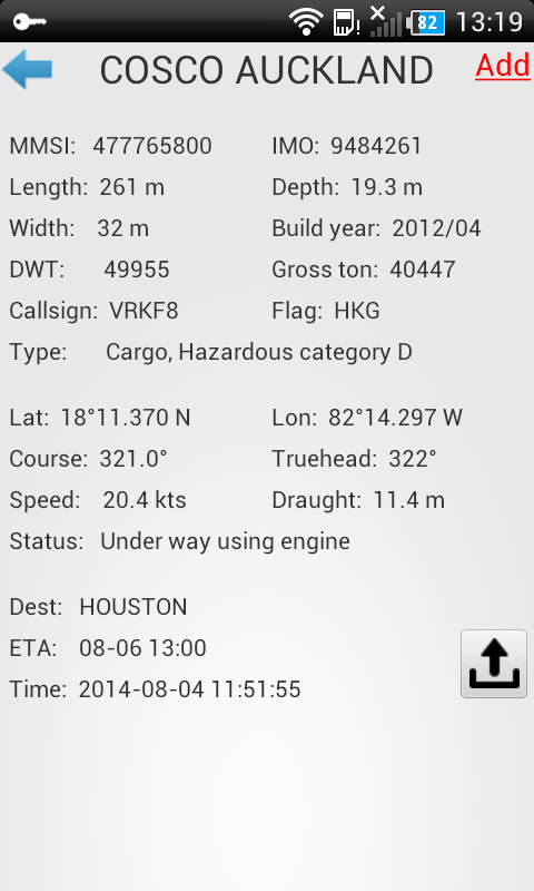 * Angaben zum Schiff (AIS-Informationen, Tonnage, Baujahr, Eigentümer/Manager, Inmarsat-Kommunikation, Fotos).