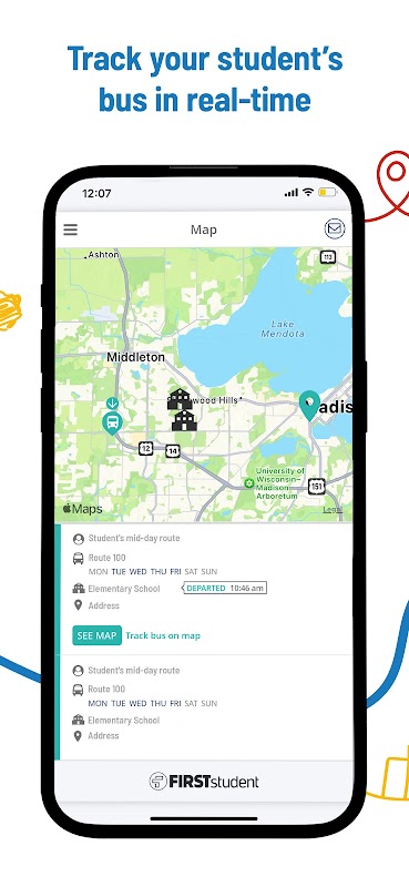 • Die FirstView®-Karte zeigt Ihnen den aktuellen Standort und die Richtung des Schulbusses, den Haltestellenplan Ihres Schülers für den aktuellen Tag sowie die Ankunfts- und Abfahrtszeitpunkte der Schule.