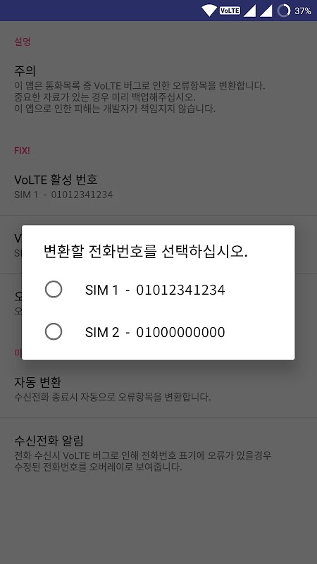 이 앱은 통화목록 중 VoLTE 버그로 인한 오류항목을 변환합니다. 중요한 통화기록이 있는 경우 미리 백업해주십시오.