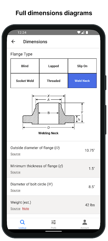 2. Sofortige Datensuche. Geben Sie einfach die erforderlichen Eingaben ein (z. B. Rohrnenngröße und Flanschklasse), und die App trägt sofort die richtigen Werte für die gesuchten Flansch-, Rohr- oder Schraubenausgaben ein.