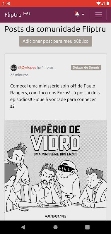 Wenn Sie also Leute finden möchten, die gerne lesen und Comics erstellen, wenn Sie neue Werke entdecken möchten, die Sie online lesen können, oder wenn Sie einen Platz zum Veröffentlichen Ihrer Comics auf Portugiesisch haben möchten, dann ist Fliptru der richtige Ort dafür!