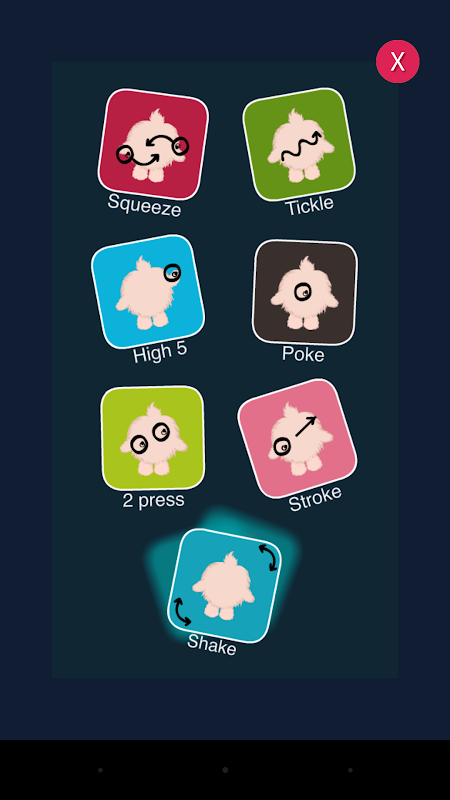 Fluffster is a little cute and fuzzy monster, but he gets sad very quickly and he needs your help. You can make Fluffster happy just by Tickling, pressing, poking, shaking, stroking or hi fiving him. However, taking care of Fluffy is not that easy, you need to manage all this action in a short period of time so try not to get it wrong so Fluffy does not get sad again.