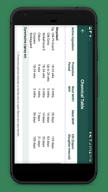 This app assists decisions about the appropriate chemical for flystrike prevention whilst observing chemical withhold periods. You can view the main chemical groups and the relevant wool, local slaughter and export interval date for each chemical. The app then lets you set an application date and prepares a timeline for that application.