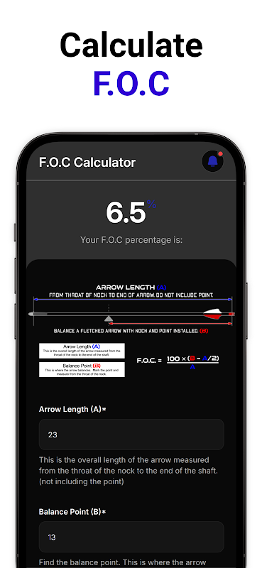 Präzise F.O.C. Berechnungen: Berechnen Sie den F.O.C. Ihres Pfeils. Geben Sie sofort den Prozentsatz ein und sehen Sie, ob er für Ihre Bedürfnisse optimal ist.