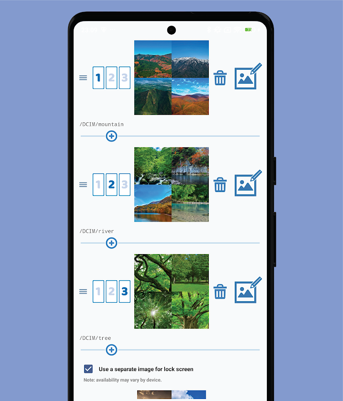 Dies ist eine Live-Wallpaper-App, die Ihren Hintergrund automatisch mit Bildern aus ausgewählten Ordnern ändert.