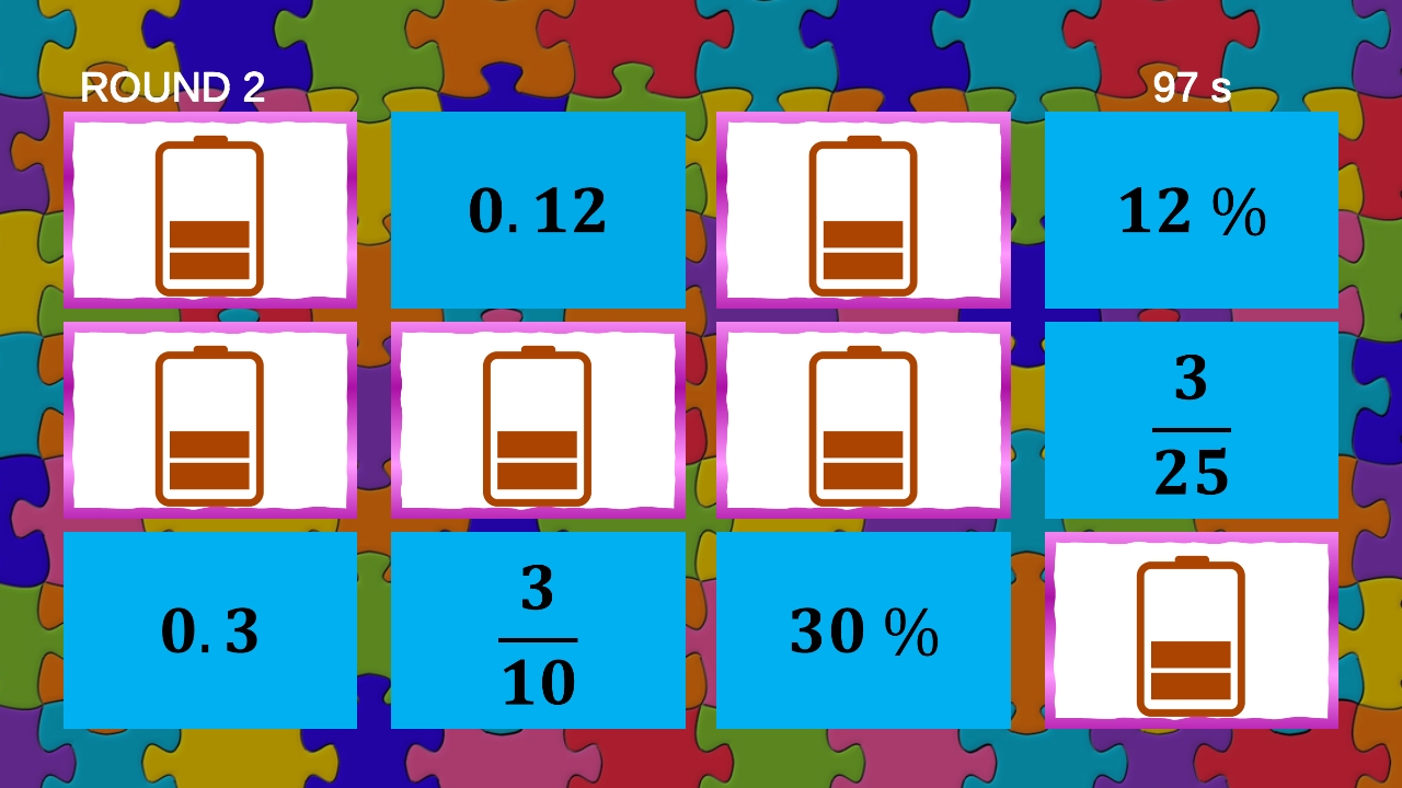 Das Konzept des Spiels besteht darin, Trios zu finden, die zueinander passen. Wenn Sie beispielsweise einen Bruch wie 1/4 finden, müssen Sie nach der zugehörigen Dezimalzahl (0,25) und Prozentzahl (25 %) suchen. Dies hilft Ihnen zu verstehen, wie derselbe Wert unterschiedlich ausgedrückt werden kann.