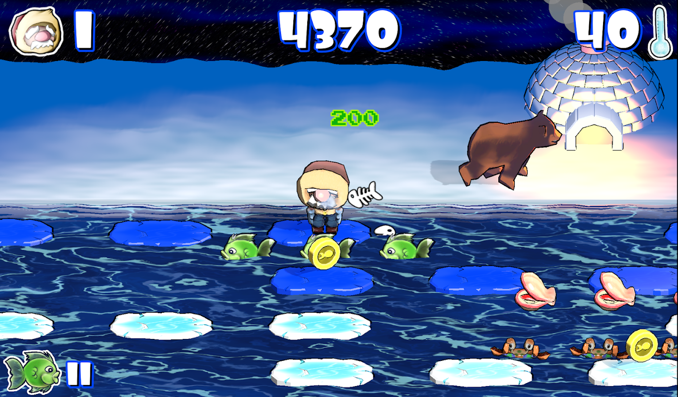 Deine Welt ist eiskalt. Du musst so schnell wie möglich deinen Unterschlupf bauen. Die Zeit wird knapp und du musst Eisblöcke sammeln, um dein Iglu rechtzeitig fertigzustellen. Vermeiden Sie einen bösen hungrigen Bären, der Sie um jeden Preis fangen will. Springe in das gefrorene Meer, von Eisblock zu Eisblock, verschlinge köstliche Fische und weiche Krabben, Möwen und Austern aus, die dich einfach auf den Meeresgrund bringen wollen. Baue dein gemütliches und warmes Iglu und finde dein warmes und schützendes Zuhause
