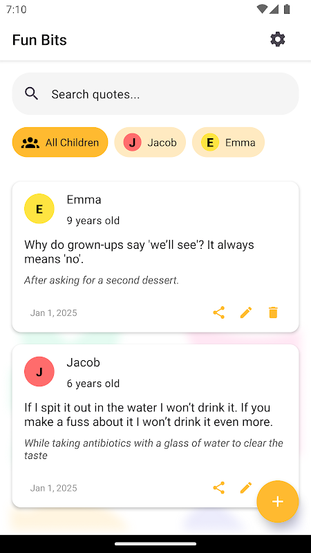 Fangen Sie den Zauber der Kindheit mit Fun Bits ein, der ultimativen App, mit der Eltern die lustigsten, süßesten und unvergesslichsten Zitate ihrer Kinder aufzeichnen, organisieren und in Ehren halten können. Egal, ob es sich um einen unerwarteten Einzeiler oder einen herzerwärmenden Moment handelt, Fun Bits hilft Ihnen, diese Schätze für immer zu bewahren.