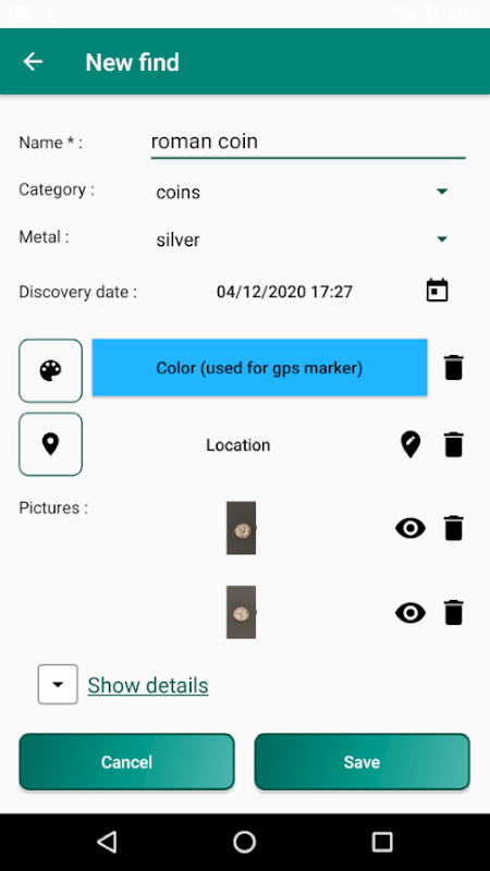 > Verwalten Sie Ihre Sammlung und Ihr Inventar von Objekten, die Sie mit Ihrem Metalldetektor gefunden haben (Bild, Gewicht, Höhe, Kommentar ...)