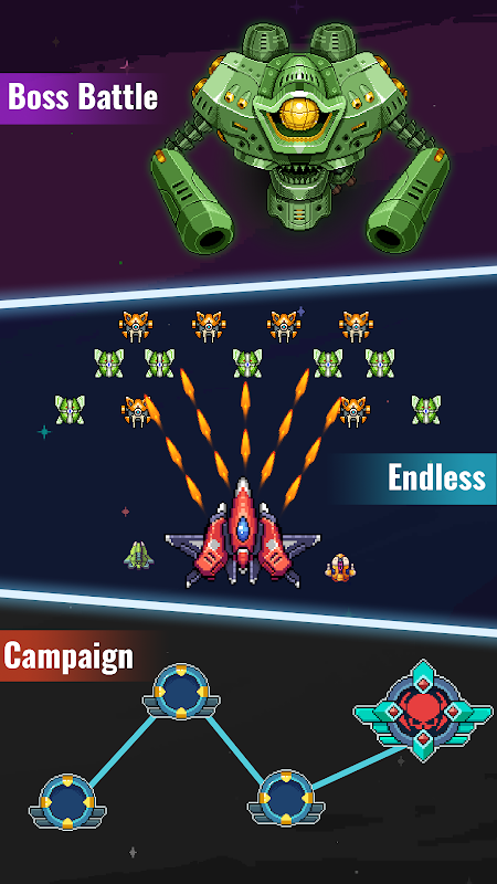 – Attraktivere Modi: Erlebe und entdecke die Galaxie-Shooter mit verschiedenen Modi wie Endlos, Turnier … und sichere dir mehr Belohnungen und Spannung.