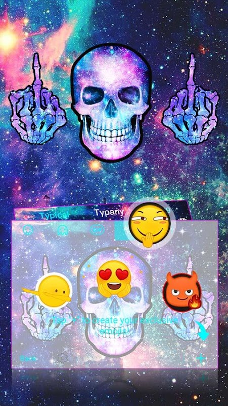 New Free Typy Galaxy Schädel-Tastatur-Thema wird zu Ihrer Tastatur und Text-Eingabe ein wirklich neues Look & Feel. Überprüfen Sie diesen FREIEN personalisierten Entwurf für Ihre Typany Emoji Tastatur gerade jetzt!