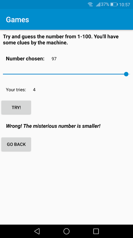 The computer thinks of a number. You then try and guess the number. Each time you guess the machine will tell you wether the number you guessed was correct. If not, he will tell you if the magic number is greater or smaller
