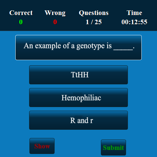 Diese Genetik-App wurde entwickelt, um Ihre Genetik-Fähigkeiten zu testen. Diese App hat mehr als 10.000 Multiple-Choice-Fragen und Antworten. Diese Genetik-Quiz-App eignet sich für alle niedrigeren, mittleren und höheren Stufen. Die Fragen auf allen Ebenen werden nach dem Zufallsprinzip angezeigt. Der Benutzer kann das Wissen über Genetik verbessern und in Prüfungen auf High School-, College- und Wettbewerbsniveau gute Ergebnisse erzielen. Dies ist eine kostenlose Version und Sie können sowohl offline als auch online verwendet werden.