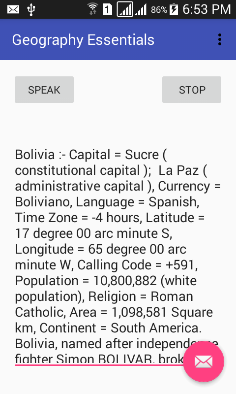 This Software is a tool to make Geography understood in a lucid style. It deals with almost all avenues of Geographical Concepts. It offers reliable ample data on Continents, Countries, Cities, Rivers, Oceans, Deserts, Mountains, Climate, Earth, Crop, Oil, Minerals, Beverages etc. It offers Listening and reading to maximize the learning in easiest way. Software is meant for all from 8th to PhD. This App consists of most of the essentials of Geography which are basics and necessarily needed to a geographer.