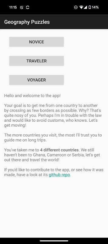 Die App stellt dir Fragen wie: „Was ist der kürzeste Weg von Spanien nach Deutschland (über die minimale Anzahl an Grenzen)?“ Die Antwort lautet: Spanien -> Frankreich -> Deutschland. Du fängst leicht an und arbeitest dich dann zu deutlich anspruchsvolleren Fragen vor, bei denen du mehrere Grenzen überqueren musst. Zum Beispiel: Was ist der kürzeste Weg von Südkorea nach Polen?